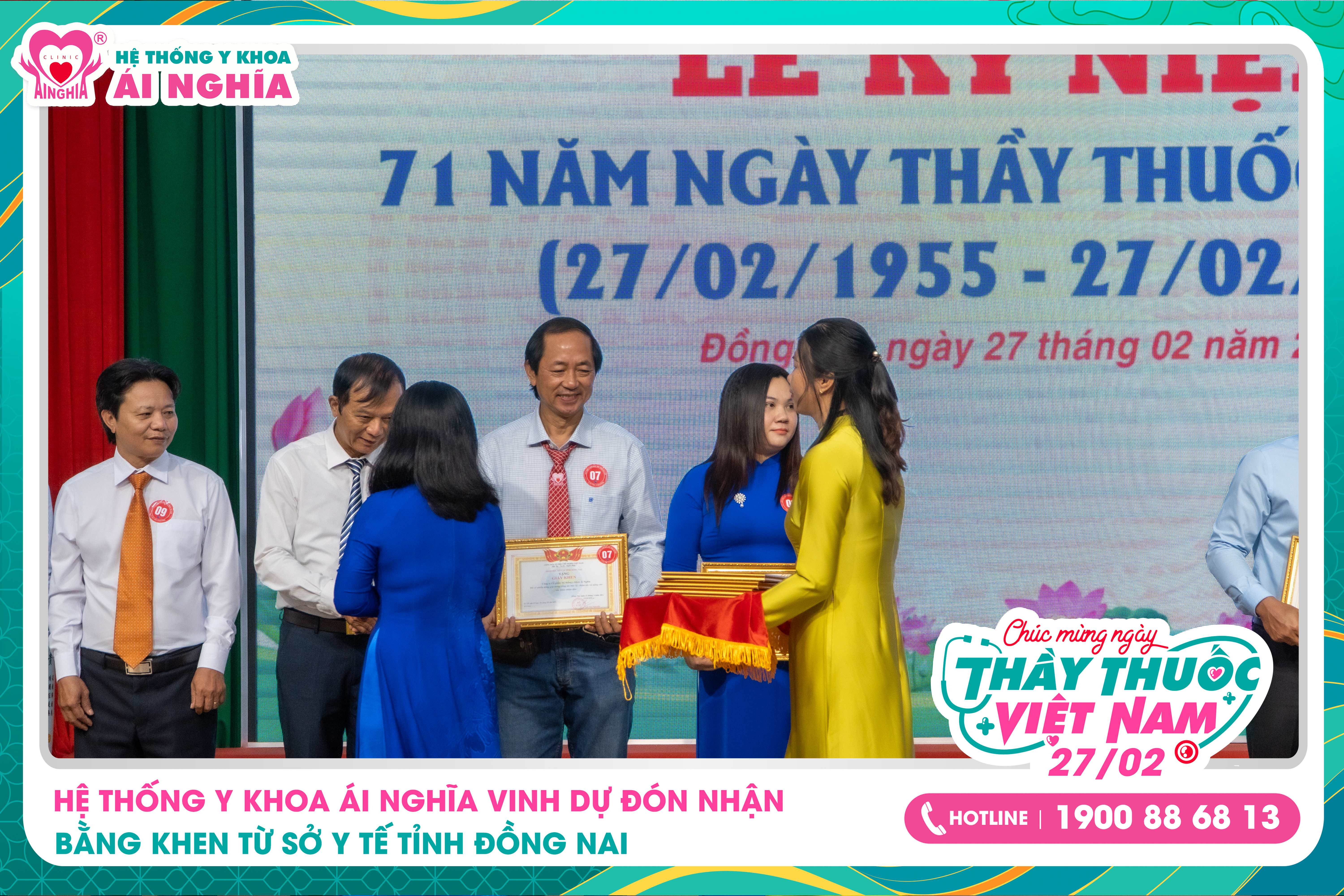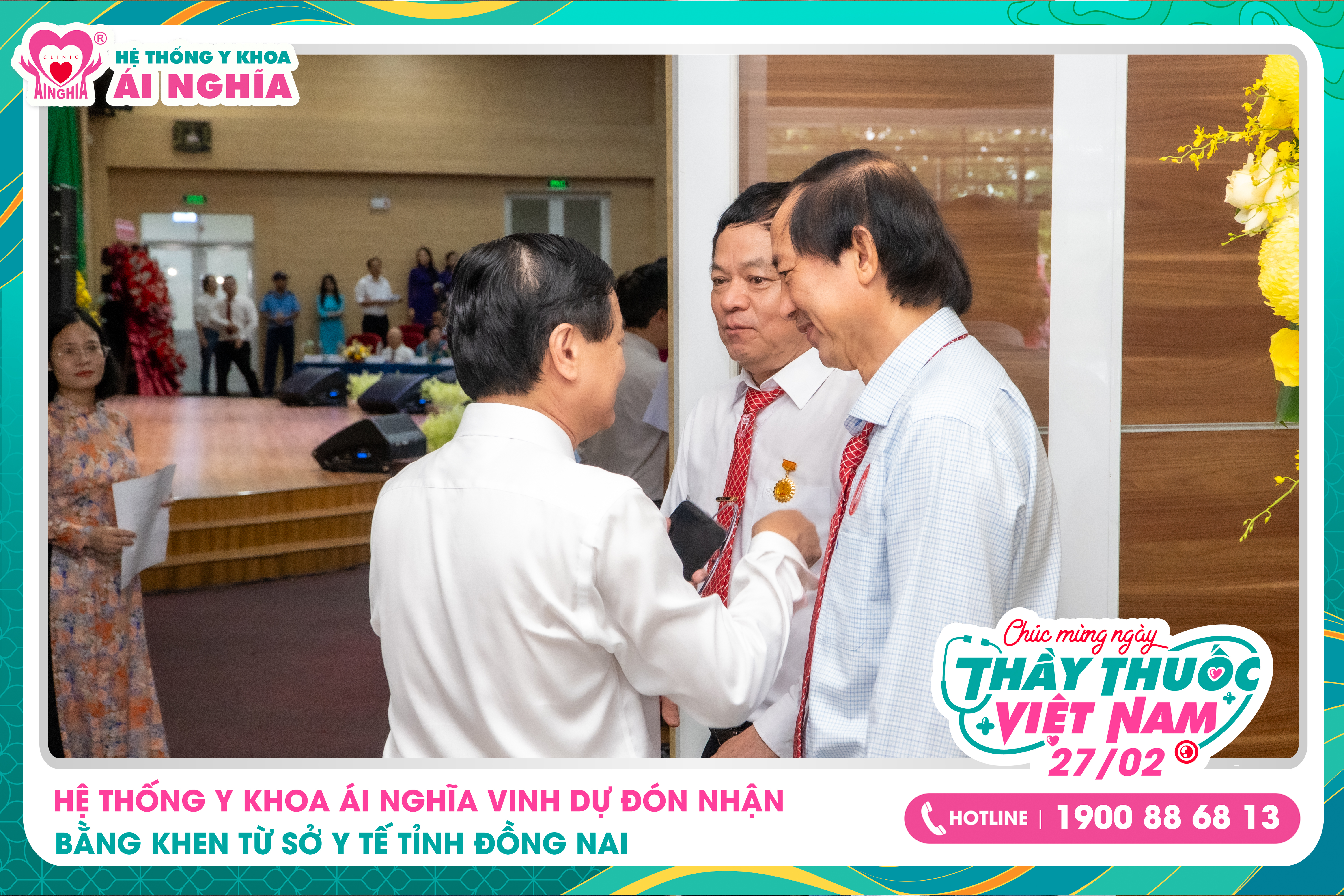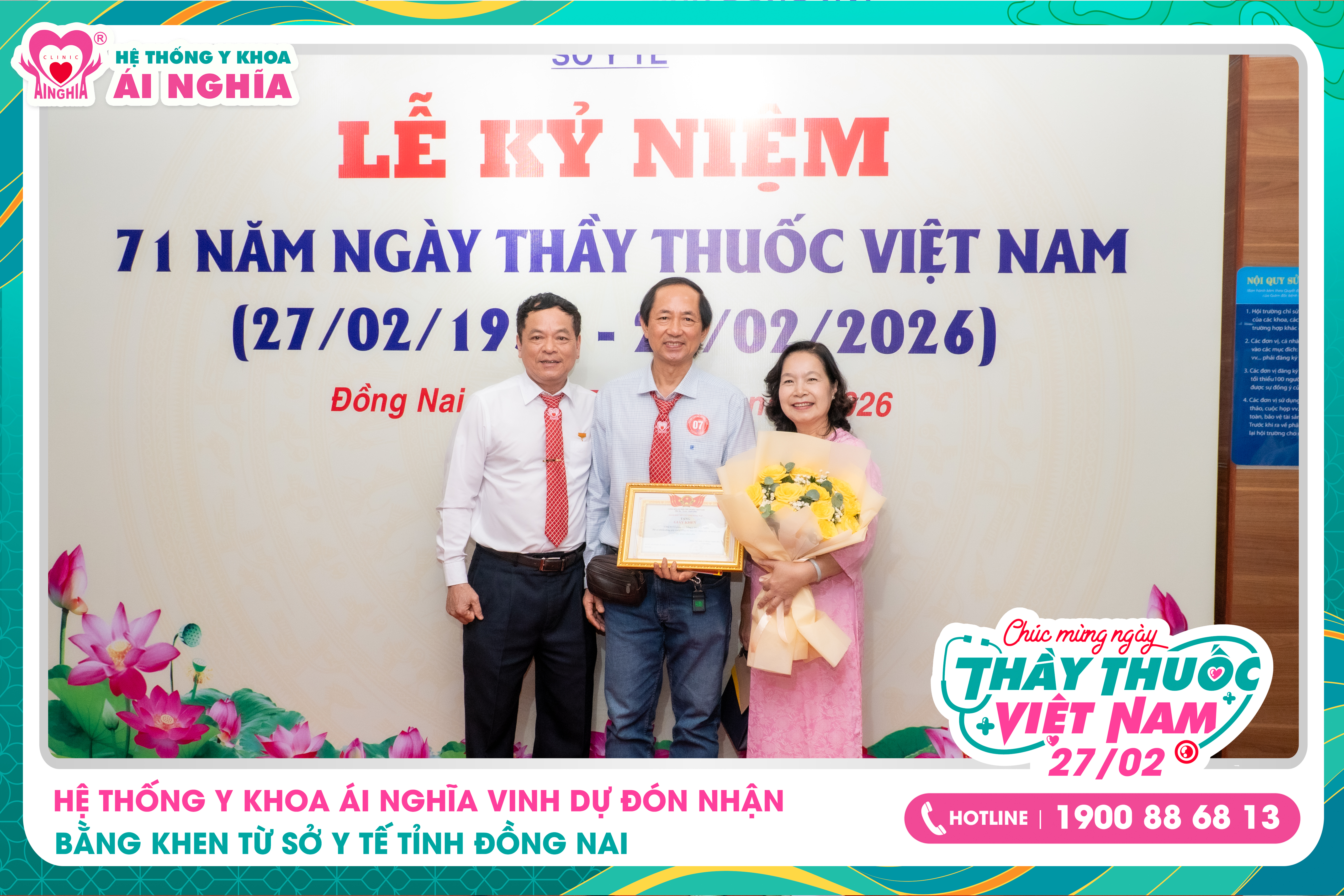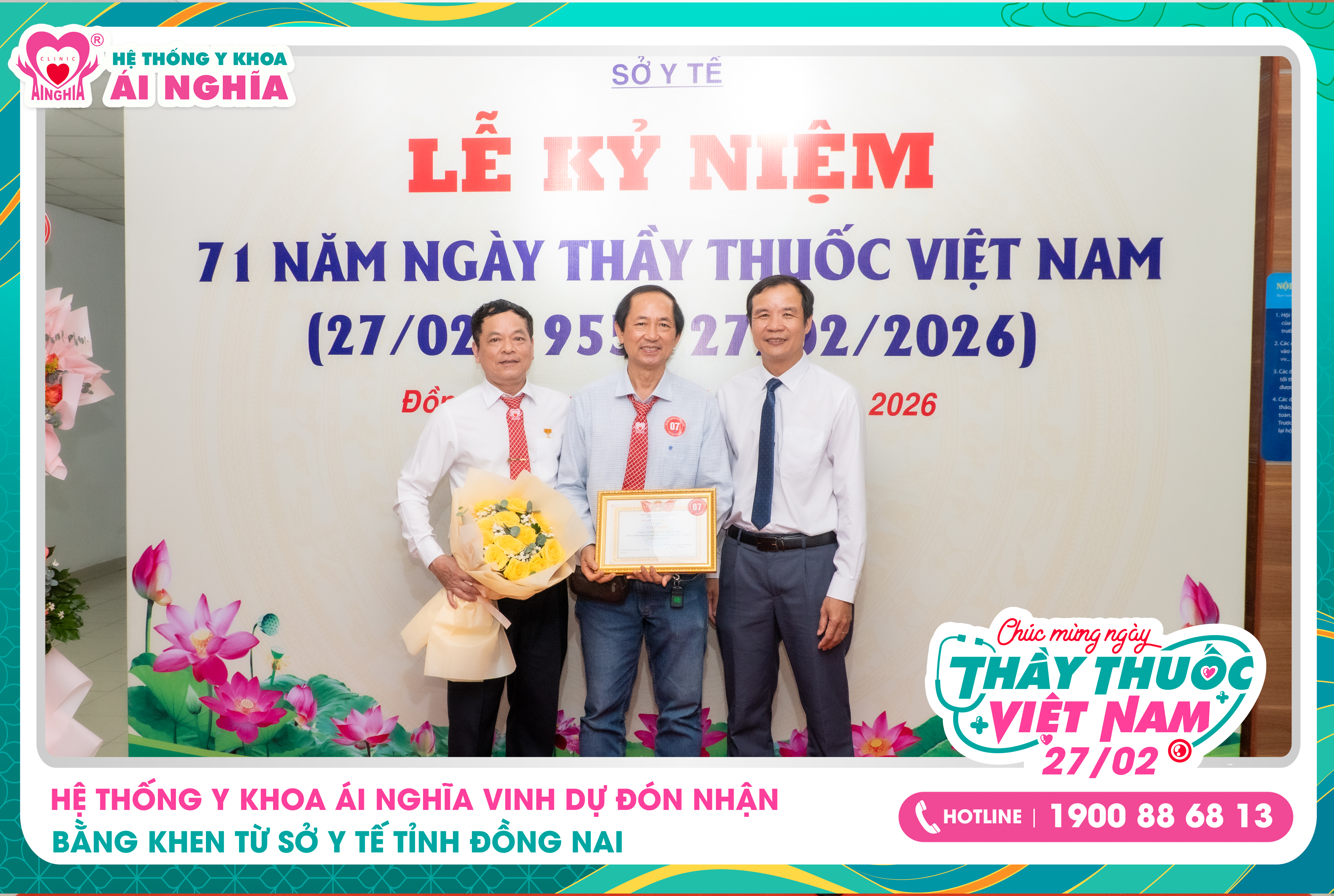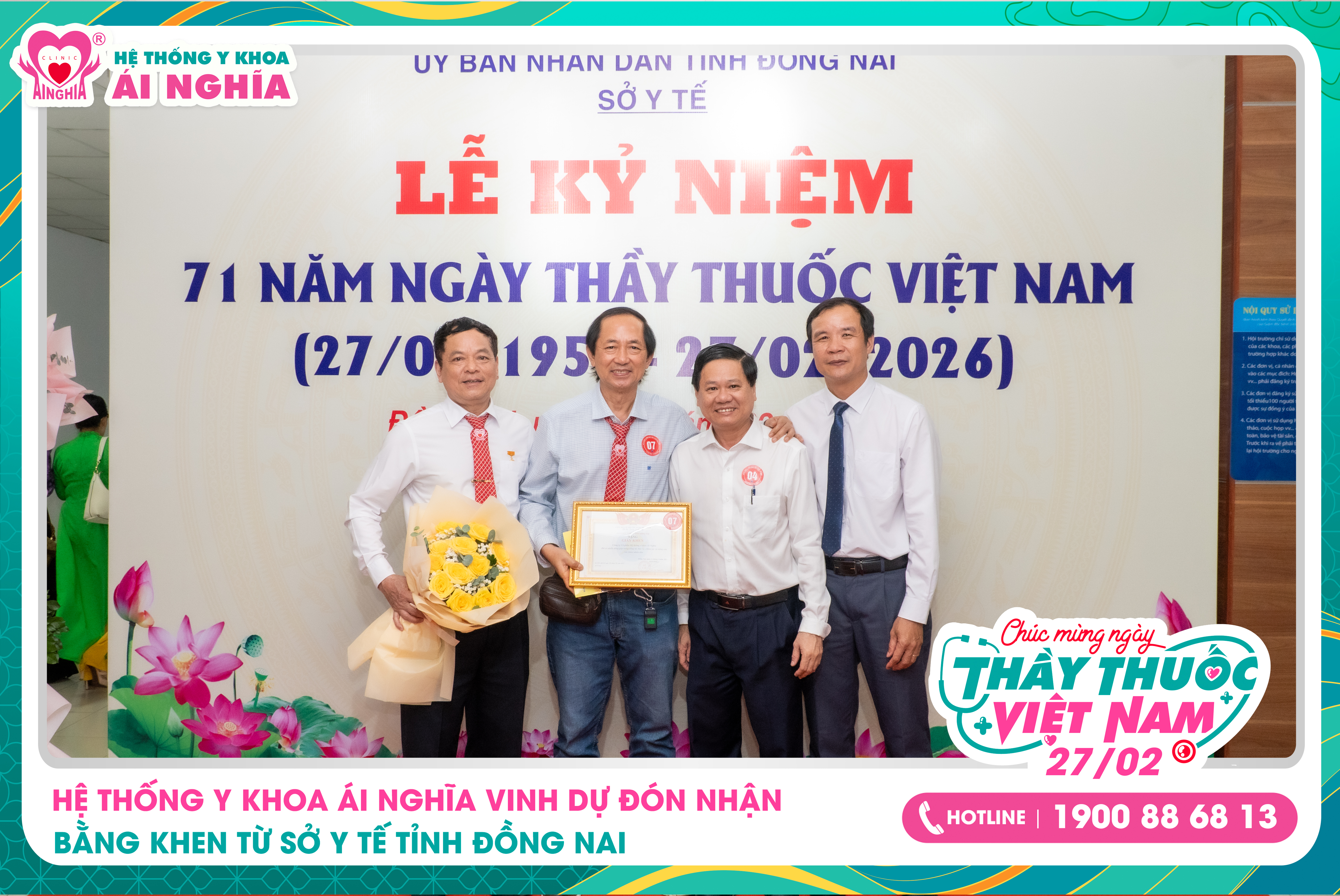 Nhân dịp Lễ kỷ niệm 71 năm Ngày Thầy thuốc Việt Nam (27/02/1955 – 27/02/2026), Hệ thống Y khoa Ái Nghĩa vinh dự được Sở Y tế tỉnh Đồng Nai trao tặng Bằng khen vì những đóng góp tích cực trong công tác bảo vệ, chăm sóc và nâng cao sức khỏe nhân dân trên địa bàn tỉnh.