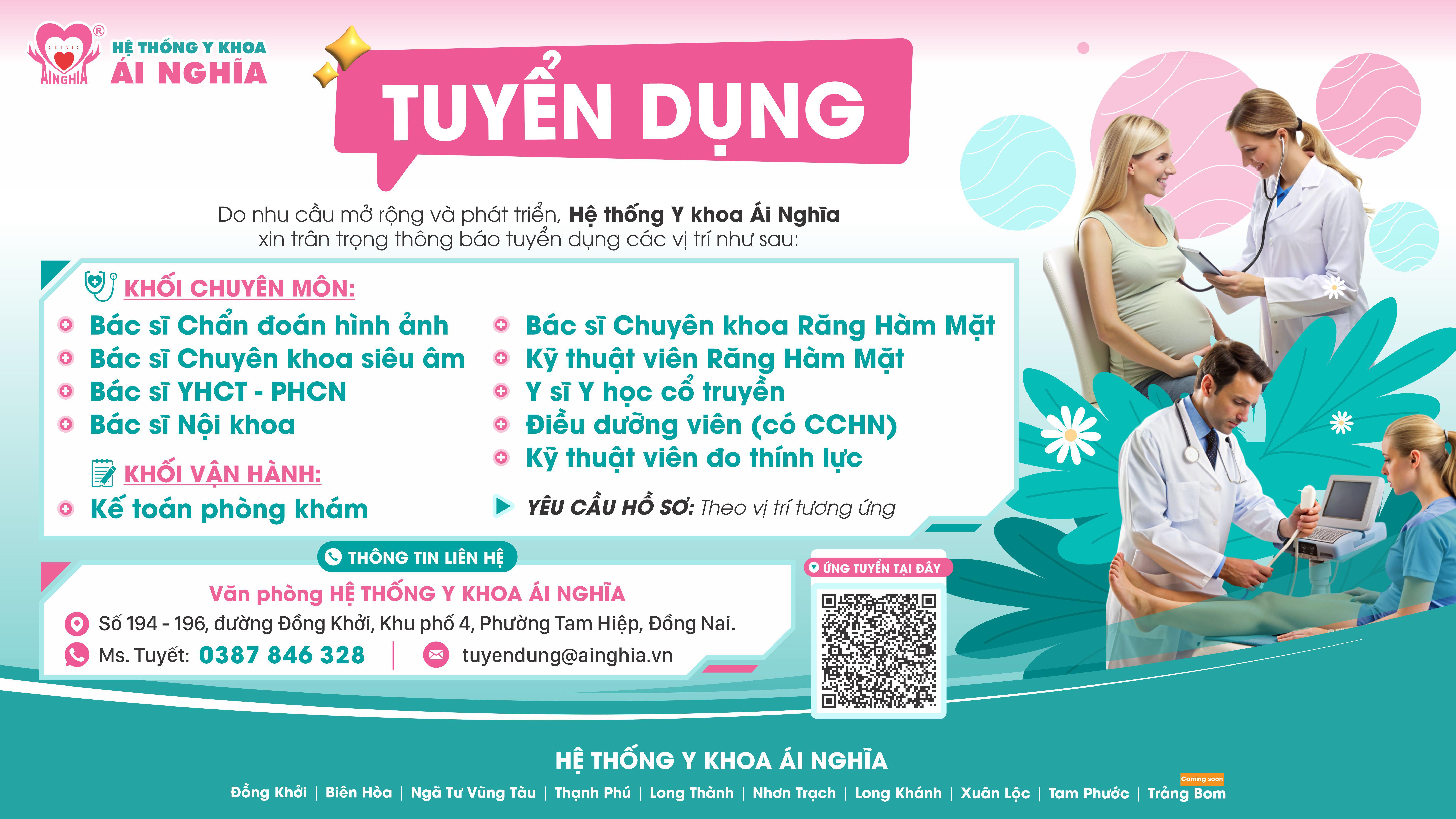 Do nhu cầu mở rộng và phát triển, Hệ thống Y khoa Ái Nghĩa xin trân trọng thông báo tuyển dụng các vị trí như sau: